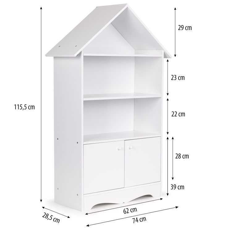 Regał na zabawki dla dzieci to uniwersalny, biały mebel idealny do pokoju dziecięcego. Posiada trzy funkcjonalne półki oraz zamykaną szafkę, co pomaga utrzymać porządek i przechowywać ulubione książki, zabawki oraz inne przedmioty dziecka. Wykonany z wytrzymałej płyty wiórowej i wykończony odporną okleiną, dzięki czemu regał jest solidny i stabilny.